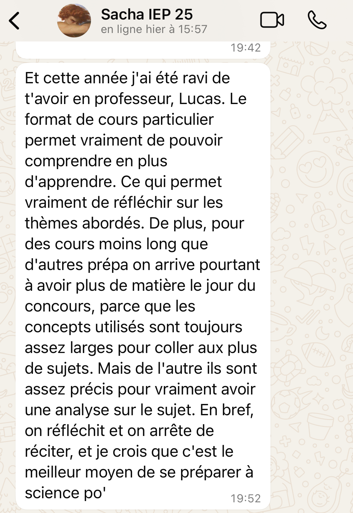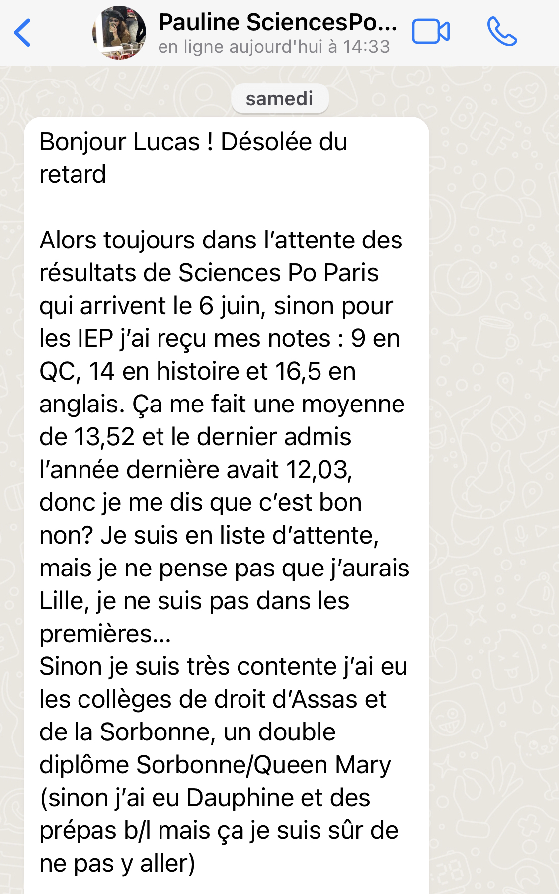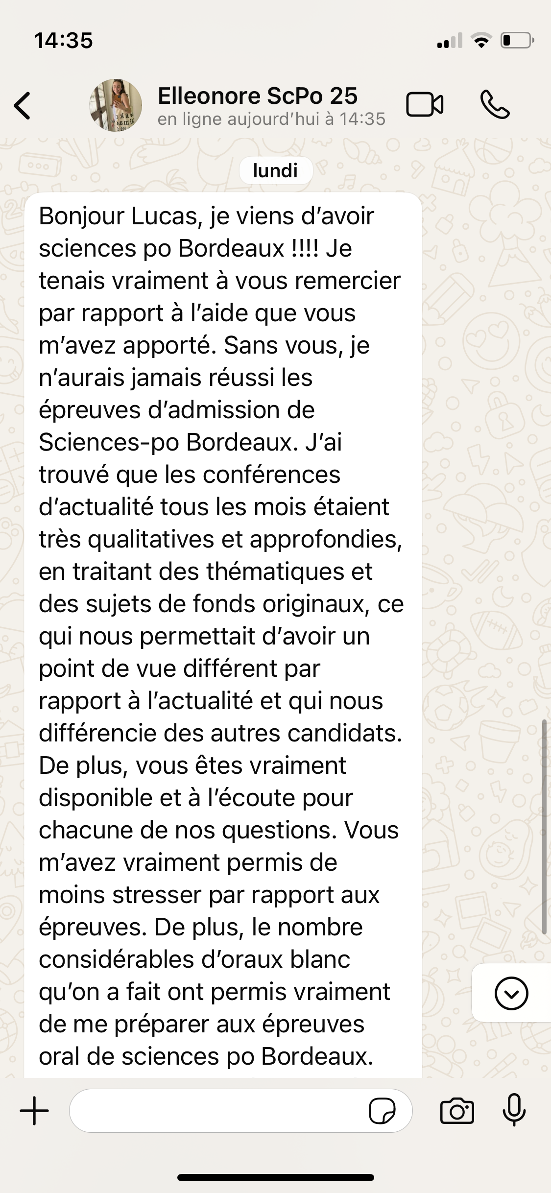 Tout au long de l’année, je suis disponible par whatsapp pour répondre à tes questions mais aussi t’informer des dates clefs à respecter et autres infos pertinentes relatives au concours.