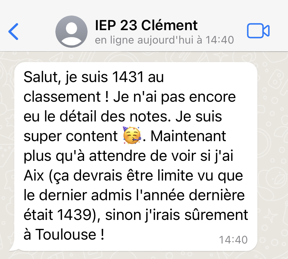 En moyenne 60% des élèves préparés avec mon accompagnement réussissent le concours commun des IEP.
